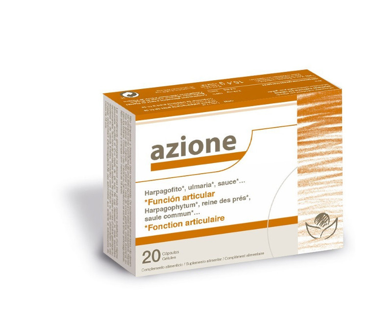 Azione es una combinación de activos naturales. Gracias a unos estudios realizados en la Facultad de Químicas de la Universidad de Murcia se ha determinado que contiene 8 principios activos volátiles con función antimicrobiana, antioxidante y antiinflamatoria. El efecto antiinflamatorio y analgésico está producido por los harpagósidos y su contenido en salicilina que produce una inhibición de la enzima ciclooxigenasa dando lugar a efectos, antiinflamatorios, analgésicos y antipiréticos.