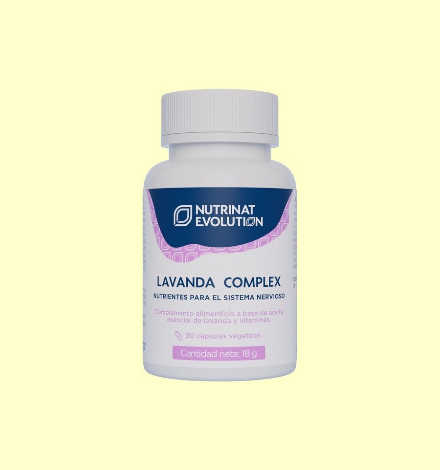 Lavanda Complex Nutrinat Evolution es un complemento alimenticio formulado para el bienestar del sistema nervioso. Su composición incluye aceite esencial de lavanda, reconocido por sus propiedades relajantes, y un conjunto de vitaminas del grupo B.