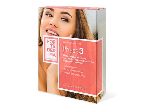 Phase3 vía oral refuerza el cabello, las uñas y la piel, proporcionando los nutrientes necesarios para una buena alimentación a esas zonas, como son las vitaminas, aminoácidos, minerales y ácidos grasos esenciales. actúa directamente a nivel de las extructuras celulares, ejerciendo un efecto estimulante y antioxidante, protege y mejora el estado del cuero cabelludo, aporta vigor y flexibilidad al cabello, fortalece las uñas y da salud-belleza a la piel.