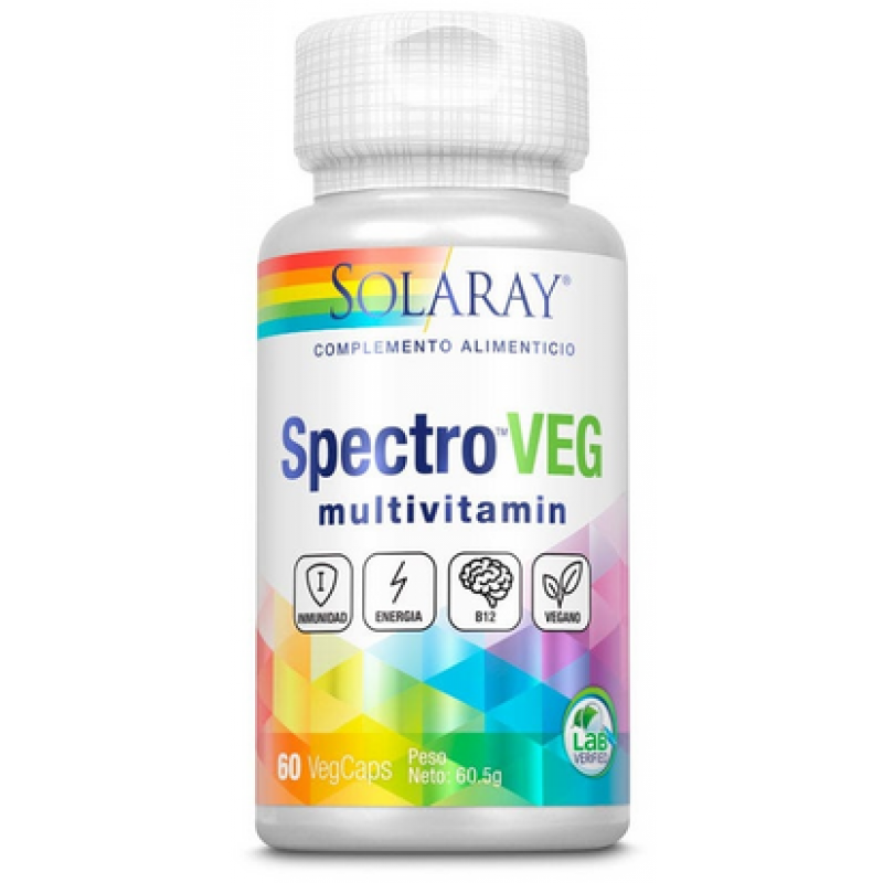 Solaray Spectro Veg Multivitamin 60 Cápsulas. Es un complemento alimenticio a base de multivitaminas y minerales. Contiene más de 30 vitaminas y minerales, con antioxidantes, y una combinación de carotenoides, minerales, enzimas, plantas y concentrado vegetal.